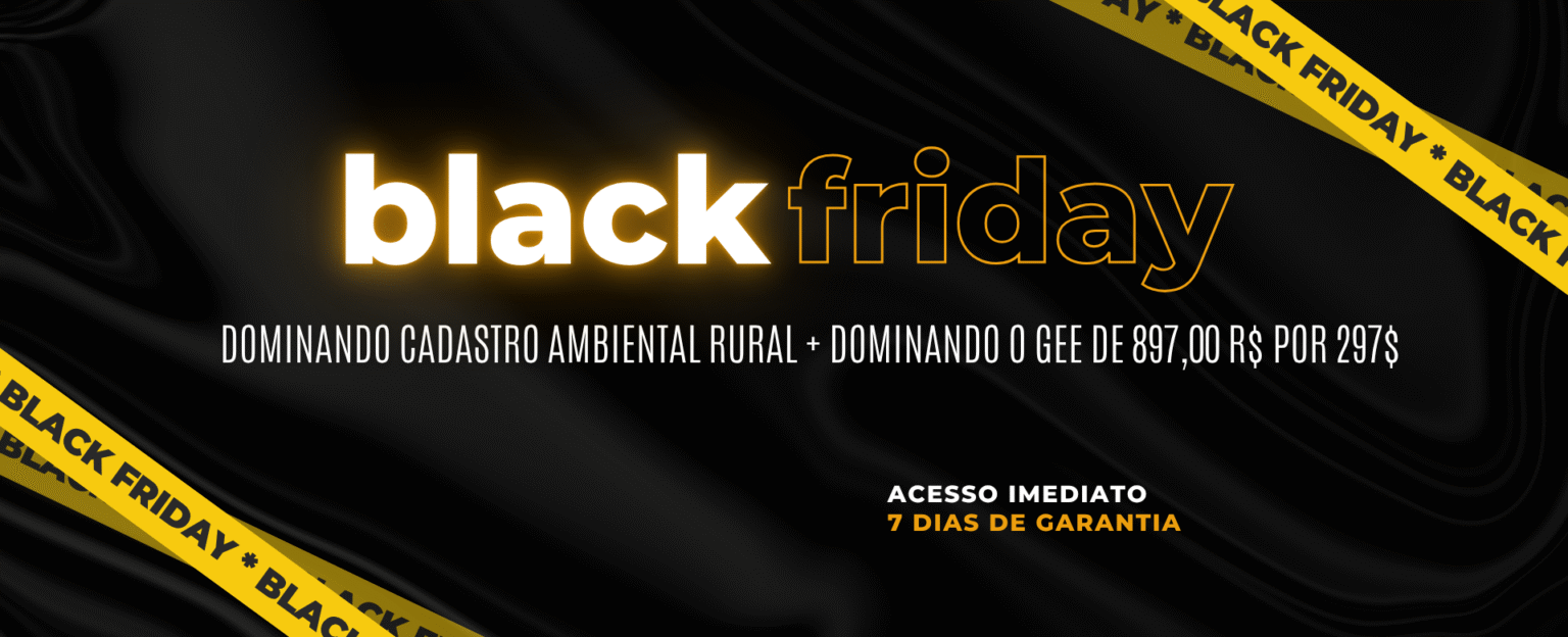 Oferta imperdível da Black Friday! Dois cursos completos para você dominar o Cadastro Ambiental Rural (CAR) e o Google Earth Engine (GEE) aplicado ao geoprocessamento e sensoriamento remoto.